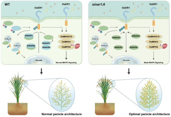近日,中国科学院分子植物科学卓越创新中心与西北农林科技大学合作,揭示了水稻E3泛素连接酶家族SINARs通过二元调控类受体激酶OsER1稳态塑造水稻高产理想穗型的分子机制,并通过特异性敲除该家族中一类特殊的兼具拮抗功能的关键节点基因SINAR1和SINAR6,打破了水稻产量性状之间的偶联性,为作物高产育种提供了新的分子模块和思路。