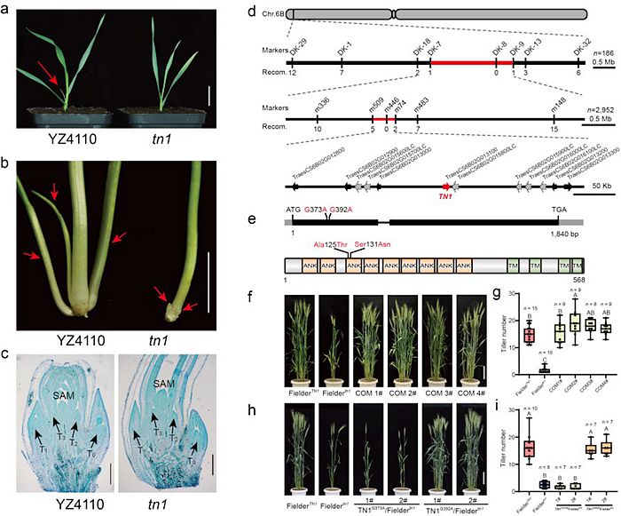 研究人员从突变体库中筛选到一个少分蘖突变体tn1,通过图位克隆方法得到分蘖调控新基因TN1,该基因编码一个含有四个跨膜结构域的锚定蛋白。实验表明,TN1蛋白中一个保守氨基酸的替换突变导致tn1突变体分蘖芽的伸长受到抑制。进一步研究发现,tn1突变体茎基部和分蘖芽中脱落酸含量均显著增加;同时,TN1与脱落酸受体TaPYL存在物理互作,TN1突变后显著增强脱落酸信号转导路径进而抑制分蘖芽的发育。该研究揭示了植物激素脱落酸抑制小麦分蘖发育的分子机制,为小麦株型改良和产量提高提供了新的基因资源和理论支撑。