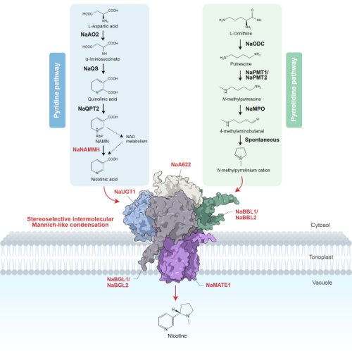 团队在野生烟草中发现一个尼古丁缺失突变体,并锁定尼古丁吡啶环合成的关键基因。团队进一步鉴定出一系列参与尼古丁最终合成的关键组分,包括糖基转移酶、还原酶、类小檗碱桥酶、糖苷水解酶及MATE转运蛋白。