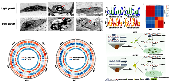 该研究发现植物特异蛋白EMF1能调控RNA甲基化和组蛋白修饰在全基因组水平上的协作关系,在植物营养生长阶段可同时作为抑制子和激活子调控特定的开花、种子发育以及叶绿体发育和光合作用等关键下游靶基因转录。两个不同的作用方式精确调控了植物正常的营养生长,促进了植物的光合作用,从而为植物生殖生长和种子的形成积累了能量。该研究不仅为植物表观遗传和基因组学相关研究提供了重要数据资源,而且深入揭示了RNA甲基化在染色质表观修饰可塑性的贡献,并为复杂的表观调控网络在作物高光效、高产等基因转录调控中的作用提供了新认知。