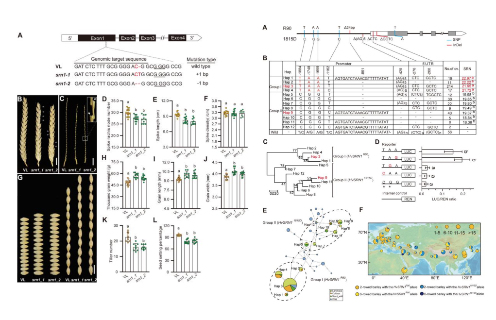 大麦抗逆性、适应性强,具备食用、饲用和酿造等广泛用途,是全球第四大禾本科作物。一直以来,产量相关基因的克隆和调控机理解析都是作物科学研究的热点和难点,该研究围绕穗轴节数(SRN)性状,成功克隆了控制穗轴节数的基因HvSRN1。研究发现,该基因在幼穗中特异表达,其启动区的两个关键单碱基变异导致HvSRN1基因表达量显著差异,从而导致双亲的穗轴节数差异。靶向编辑HvSRN1获得的突变体穗轴节数和穗长均显著降低,同时千粒重增加。系统发育分析发现,该基因是水稻OsLAX2和玉米ZmBA2等的同源基因,酵母双杂、荧光互补试验等也证实HvSRN1和HvLAX1之间存在互作,表明禾本科作物在调控穗发育方面存在共通的LAX2-LAX1模式。HvSRN1对穗粒数与千粒重性状平衡调控机制的解析,及其在全球大麦和青稞中的优良等位变异分析,为大麦和青稞产量性状的遗传改良和分子育种提供了新途径。