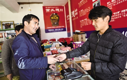 青海省海北藏族自治州刚察县泉吉乡年乃索麻村牧民列知(左)在中国农业银行年乃索麻村惠农金融服务点办理取款业务。近年来,青海省积极推动普惠金融综合示范区试点建设,完善基础金融服务,打通金融服务“最后一公里”。 新华社记者 张宏祥摄
