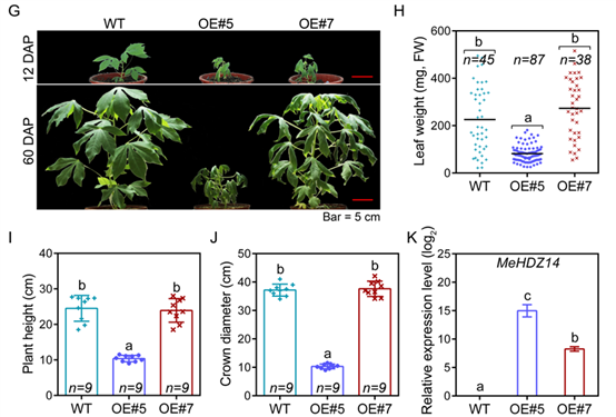 近日,中国热科院生物所揭示了同源异型-亮氨酸拉链(HD-Zip)转录因子家族成员调控木薯植株发育与干旱胁迫响应平衡的机制。研究挖掘到一个响应干旱胁迫的HD-Zip转录因子基因MeHDZ14,详细研究了该转录因子调控木薯株高和叶片发育的功能及分子机制。