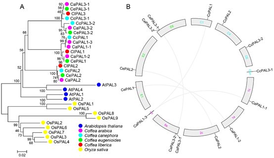 咖啡属物种PAL基因极大似然进化树及染色体分布