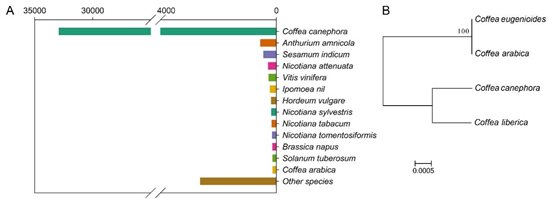 大粒种咖啡转录本注释(A)及单拷贝基因构建的咖啡属极大似然进化树(B)