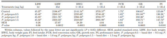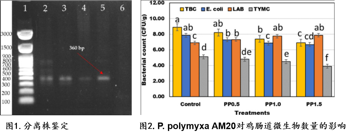 图3.P. polymyxa AM20对致病菌的体外抗菌活性及其对肉鸡生长性能的影响