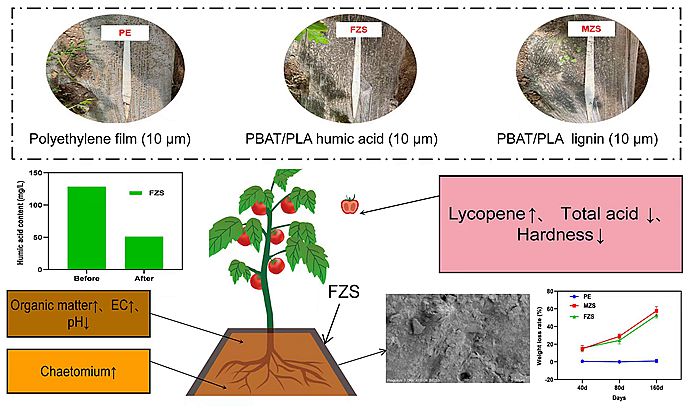 研究人员发现,PBAT/PLA腐殖酸生物降解地膜(厚度10 微米)在田间覆盖131天,其降解程度达到降解2级,地膜表面呈现出明显的疏松多孔结构。与聚乙烯地膜相比,覆盖PBAT/PLA腐殖酸生物降解地膜后,番茄产量明显增长,番茄的可溶性固形物、维生素C、可溶性糖和番茄红素显著提高,总酸和硬度显著降低。该研究为进一步推进生物降解地膜在生产中的应用和聚乙烯减量替代奠定基础。